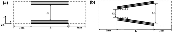 狹縫孔由半有限狹縫孔由兩個平行的石墨壁組成。每個壁包含三個石墨烯層,如圖1(a)所示?虻奶摼表示模擬框在y和z方向上的邊界。周期性邊界條件僅適用于x方向。兩個開口端與大塊氣藏相連,每個氣藏沿y軸的長度為3nm,孔隙寬度決定了z方向的尺寸。因此,通過孔內分子與體相的相互作用,可以在孔和周圍環(huán)境之間保持機械平衡?讖紿是指通過一個壁最內層中碳原子中心的平面與相對壁的相應平面之間的距離。楔形孔在圖1(b)描繪了一個開放的楔形孔及其結構參數(shù):小端(SH)和大端(BH)的孔徑,軸向孔長(L)和半角(α)?虻奶摼表示模擬框在y和z方向上的邊界。與狹縫孔一樣,開口端周圍的氣體沿y軸的長度為3nm,大端的寬度決定了z方向的尺寸。沿軸向(即,y方向)的孔長度是有限的L,而在x方向上的尺寸在應用周期性邊界條件的情況下假定為無限。