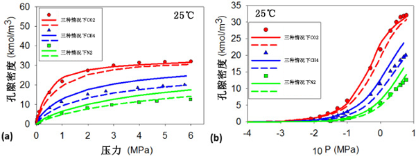 圖2:純氣體N2、CH4和CO2在T=25℃時在活性炭上的實驗數(shù)據(jù)。用狹縫和楔形孔中的吸附等溫線預測數(shù)據(jù):(a)絕對壓力和(b)對數(shù)標度的絕對壓力。