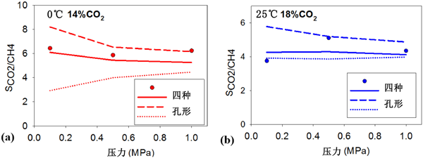 圖4:在T =(a)0℃和(b)25℃時,在大約20%的二氧化碳在活性炭孔隙呢,CO2對CH4的選擇性與實驗數(shù)據(jù)。