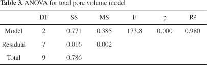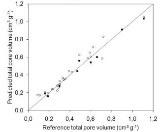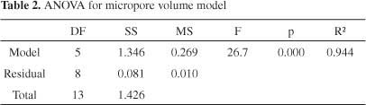 這個方程適用于微孔體積預(yù)測,用包含文獻(xiàn)中的數(shù)據(jù)和由我們獲得的數(shù)據(jù)的測試樣品進(jìn)行評估。共測試了36個樣本。圖形比較(圖4)表明該模型具有良好的預(yù)測能力。該試驗(yàn)樣品組的平均絕對誤差為0.05cm 3 g -1,平均相對誤差為16.4%。表2給出了模型的統(tǒng)計(jì)參數(shù)。