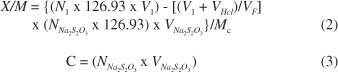 碘值根據(jù)ASTM D4607-94方法測定。碘值定義為當(dāng)濾液的碘濃度為0.02N(0.02mol L -1)時,被1.0g碳吸附的碘的毫克數(shù)。該方法基于三點(diǎn)等溫線。標(biāo)準(zhǔn)碘溶液在特定條件下用三種不同重量的活性炭處理。實(shí)驗(yàn)包括用10.0mL的5%HCl處理活性炭樣品。該混合物煮沸30秒,然后冷卻。之后不久,將100.0mL的0.1N(0.1mol L -1)碘溶液加入到混合物中并攪拌30秒。將所得的溶液過濾并50.0毫升濾液滴定用0.1N(0.1摩爾大號-1)硫代硫酸鈉,以淀粉為指示劑。每克碳吸附的碘量(X / M)相對濾液(C)中的碘濃度繪制,使用對數(shù)軸。如果殘留碘濃度(C)不在0.008-0.04 N(0.008-0.04 mol L -1)的范圍內(nèi),則每個等溫點(diǎn)應(yīng)使用不同的碳質(zhì)量重復(fù)整個過程。對這三點(diǎn)應(yīng)用最小二乘擬合回歸。碘值是殘留濃度(C)為0.02N(0.02mol L -1)時的 X / M值。所述X / M和C ^ 值分別由等式2和3計(jì)算。