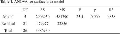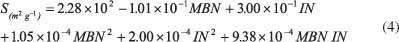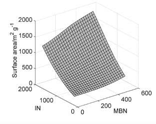 為了描述亞甲基藍(lán)和碘的數(shù)量相對于表面積的行為,使用二次模型。對于模型開發(fā),Kennard-Stone算法從105個樣本中選擇了27個樣本并用于校準(zhǔn)。樣品表面積從199到2105 m 2 g -1不等。亞甲基藍(lán)的數(shù)量在0到501毫克克每升之間,碘值從155到1670毫克克每升。建模后獲得的表面擬合(圖1)由公式4描述。