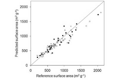 KS算法被用于分離校準(zhǔn)組和測試組中的樣品。該算法根據(jù)歐幾里德距離選擇樣本。前兩個選取的樣本彼此最遠(yuǎn)。下面的樣本是通過與之前選擇的樣本的距離來選擇的。在校準(zhǔn)組中進(jìn)行不同樣品量的校準(zhǔn)。校準(zhǔn)中使用的樣本數(shù)量被選擇來生成顯示測試組樣本的最小誤差的模型。使用最小二乘擬合來獲得校準(zhǔn)模型,以由亞甲基藍(lán)和碘值確定表面積,總孔體積和微孔體積估計(jì)。Matlab軟件被用于計(jì)算程序。
