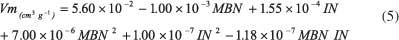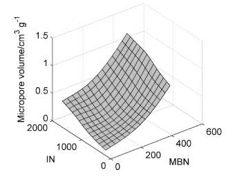也使用二次模型將微孔體積描述為亞甲藍(lán)和碘值的函數(shù)。該模型在總共50個樣本的幫助下構(gòu)建,其中從KS算法中選擇了14個樣本進(jìn)行校準(zhǔn)。校準(zhǔn)范圍為0.05至0.99cm 3 g -1。從2至427毫克克變化亞甲藍(lán)號-1和碘號碼變化從195至1670毫克克-1。建模導(dǎo)致表面擬合(圖3),由公式5描述: