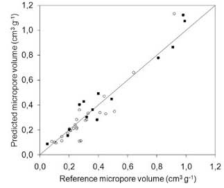 由于微孔由于其尺寸而優(yōu)先被碘分子存取,所以碘值也通過最小二乘回歸與微孔體積直接相關(guān)。然而,所獲得的誤差要高于考慮亞甲藍(lán)和碘值時的誤差。這表明亞甲藍(lán)在微孔體積預(yù)測中有一定貢獻(xiàn),可能是由于在較大微孔中的吸附。