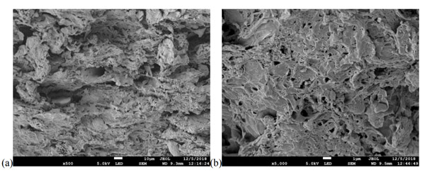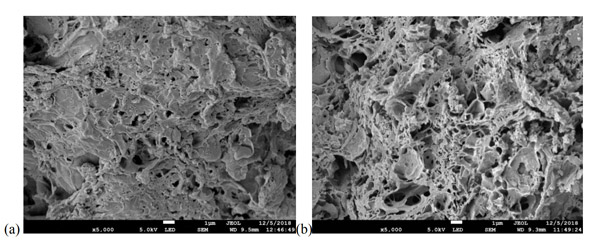 根據(jù)觀察到的活性炭微觀結(jié)構(gòu)來進(jìn)行形態(tài)研究。圖1顯示了在650°C(a)和850°C(b)兩種不同溫度下用25%H3PO4制成的活性炭的比較。可以看出,與650℃相比,在850℃下制備的活性炭具有稍大的孔。可以得知孔體積隨著活化溫度的升高而逐漸增加。