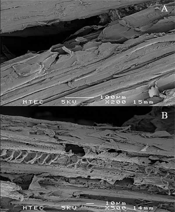 如圖3所示,將通過分離獲得的固相微結(jié)構(gòu)通過SEM與天然RH進(jìn)行了比較;钚蕴吭牧咸峁┝苏G彝暾谋砻妫砻髦参锊牧系母叨扔行虻耐暾Y(jié)構(gòu)(圖3A)。分離的固體殘余物的生物質(zhì)的表面結(jié)構(gòu)顯示出表面和內(nèi)部結(jié)構(gòu)的破壞,并具有空腔和裂紋。該觀察結(jié)果表明半纖維素的去除和表面木質(zhì)素的改變。對于BET表面積測量,分析了原始和預(yù)處理的生物量樣品。