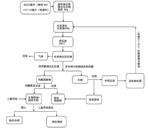在亞臨界條件350℃下通過高壓釜產生的水相用粉末活性炭處理,加入相當于130毫升水相總重量的2%的活性炭。將制備的混合物在磁力攪拌器下在30°C以600rpm混合4小時;钚蕴康臅r間和用量是經過多次試驗后選擇的,因為較長的混合時間和高用量不會影響脫氮程度。然后使用顆粒截留率為5-13μm的濾紙對收集的混合物進行真空過濾。最后,將110ml處理過的水相再循環(huán)回水熱液化單元。