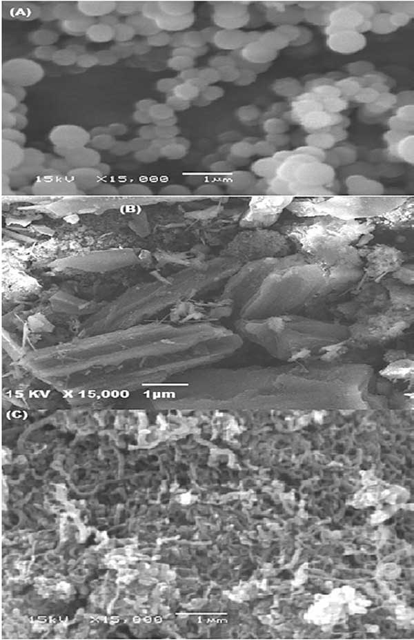 這種方法是檢查活性炭表面形態(tài)的有用方法。圖1A和1B展示了丙烯腈-共聚苯乙烯(A)和活性炭浸漬后的(B)SEM照片。這些圖顯示了球形、均勻形狀的結(jié)構(gòu),改性方法導致改性復合顆粒尺寸增加了7.95%。此外,圖1C顯示了制備的納米碳管的SEM圖片。該圖顯示了未處理樣品中存在無定形碳。此外,值得注意的是,這些管子又細又長,并且沒有大量凝聚在一起。納米碳管的管狀直徑介于75和99.25nm之間。