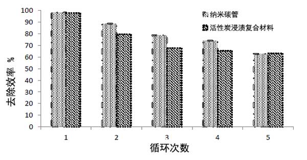 活性炭復合材料的再生具有經(jīng)濟重要性。該實驗涉及許多吸附-解吸循環(huán),以估計重復脫色對納米材料吸附效率的影響。發(fā)現(xiàn)納米碳管和活性炭浸漬材料對活性紅的去除效率略有變化,如圖3所示。數(shù)據(jù)顯示原始納米碳管和活性炭浸漬材料存在差異與不同初始活性紅染料濃度下重復使用的納米化合物相比。活性紅的吸收程度在第一個循環(huán)后達到98.18%,然后在五輪納米碳管后降低到62.72%,而對于活性炭浸漬材料,第一個循環(huán)去除效率為97.72%,在第一個循環(huán)后,在五輪后降低到63.18%,表明其再生有效性,如圖3所示。因此,可以得出結(jié)論,納米碳管和活性炭浸漬材料的吸附過程會受到延長重復使用周期的影響,而不會損失大量染料吸附能力。因此,兩種納米化合物被多次用于從水性階段去除活性紅染料。因此,這表明它們可以多次使用,證明了它們的經(jīng)濟可行性。