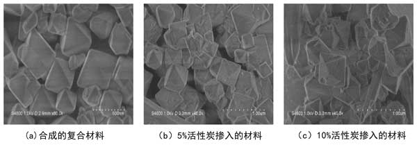 (2)SEM結(jié)果表明,三種樣品具有相似的規(guī)則八面體結(jié)構(gòu),但活性炭的加入會(huì)導(dǎo)致活性炭摻復(fù)合材料晶體表面出現(xiàn)一定缺陷。