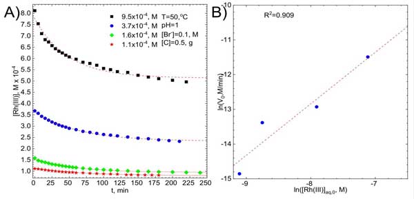 很明顯,銠溴化物絡(luò)離子的初始濃度將影響它們?cè)陔娊赓|(zhì)中的平衡濃度和吸附過(guò)程的速率。這是圖2A,其中繪制了在T=50℃下在攪拌溶液中獲得的動(dòng)力學(xué)曲線,攪拌速率為1200rpm。得到離子之間的線性相關(guān)性,確定系數(shù)接近圖2B。擬合線的斜率等于1.48±0.33,證實(shí)了初始假設(shè),即關(guān)于銠溴化物絡(luò)離子初始濃度的反應(yīng)的第一級(jí)。吸附動(dòng)力學(xué)還應(yīng)取決于活性炭的表面積,前提是系統(tǒng)不受擴(kuò)散控制。這已針對(duì)不同濃度的吸附劑進(jìn)行了驗(yàn)證。