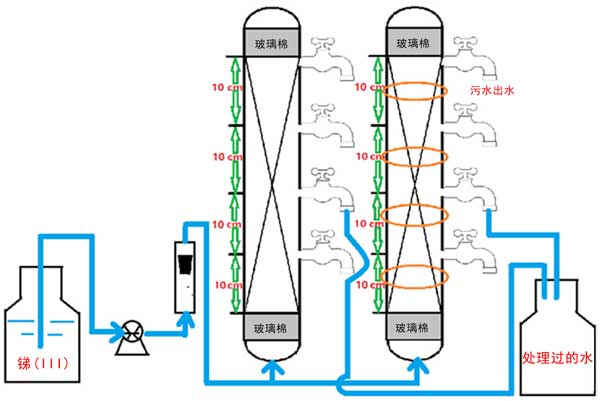 我們進(jìn)行了色譜柱實(shí)驗(yàn),以了解弱磁場(chǎng)是否可用于提高連續(xù)流動(dòng)系統(tǒng)中納米級(jí)零價(jià)鐵的反應(yīng)性。設(shè)置了兩個(gè)平行的連續(xù)柱系統(tǒng),內(nèi)徑為10mm(外徑=14mm),高度為200mm,如圖1所示。一個(gè)柱系統(tǒng)有一系列環(huán)形永磁體,最大磁場(chǎng)通量強(qiáng)度約為1800Gs(材料:釹鐵硼),每5.0厘米放置一個(gè)環(huán)形磁鐵。聚甲基丙烯酸甲酯柱填充有10g鐵與活性炭(10-20目)的混合物。柱的兩端用一小塊玻璃棉塞住。圖1描述了色譜柱組件和與之配套的實(shí)驗(yàn)設(shè)計(jì)。測(cè)試是在25±1℃下完成的。為了獲得合適的流速,使用了蠕動(dòng)泵。銻(III)離子溶液通過(guò)鐵改性活性炭床向上轉(zhuǎn)移,以確保床完全飽和。為了評(píng)估銻(III)吸附去除情況,定期采集流出物樣品。