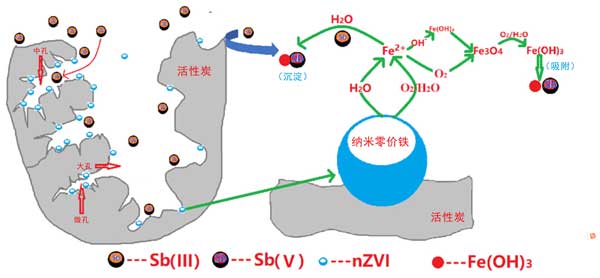 氧氣對(duì)銻(III)的氧化非常緩慢。然而,有人聲稱當(dāng)零價(jià)鐵被氧氣腐蝕時(shí),會(huì)產(chǎn)生強(qiáng)氧化劑,可以氧化各種有機(jī)和無(wú)機(jī)分子。在酸性條件下,兩個(gè)電子從鐵離子表面轉(zhuǎn)移到氧,產(chǎn)生過(guò)氧化氫。在低pH值下,過(guò)氧化氫與鐵離子的相互作用形成羥基自由基(OH-),而在pH值超過(guò)5.0時(shí),它通過(guò)反應(yīng)生成鐵(IV)。我們之前的研究發(fā)現(xiàn)活性炭對(duì)砷(III)的氧化影響比較大。這是因?yàn)榛钚蕴勘砻娓缓倌軋F(tuán),當(dāng)砷(III)擴(kuò)散吸附在活性炭表面時(shí),這些官能團(tuán)被氧化。此外,因?yàn)殇R(III)比砷(III)氧化得更快,所以銻(III)可以被活性炭快速氧化。在沒(méi)有弱磁場(chǎng)的情況下,零價(jià)鐵介導(dǎo)的銻(III)去除通常由兩個(gè)時(shí)間段組成;谏鲜鼋Y(jié)果和討論,銻(III)的去除是一個(gè)復(fù)雜的過(guò)程,包括表面吸附和氧化。圖3描繪了銻(III)去除的機(jī)制。