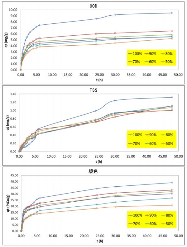 圖2:在不同棕櫚油廢水的濃度下,接觸時(shí)間對(duì):COD、TSS和顏色的吸附吸收的情況。