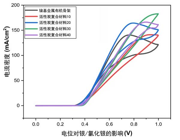 通過在KOH和CH3OH中氧化甲醇,使用循環(huán)伏安法測(cè)試活性炭復(fù)合材料的電化學(xué)性能。具有活性炭復(fù)合材料的鎳金屬對(duì)甲醇氧化反應(yīng)表現(xiàn)出更高的催化活性(見圖2)。在鎳金屬改性玻璃碳電極的情況下,峰值電流密度沒有添加活性炭的高。具有更高濃度活性炭(40mg)的樣品顯示出高峰值電流密度。隨著活性炭量(60mg)的進(jìn)一步增加,峰值電流密度降會(huì)稍微降低。綜上所述,建議將活性炭的濃度增加到一定限度可以提高電流密度。然而,增加活性炭的濃度也可能對(duì)催化活性產(chǎn)生不良后果。此外,活性炭復(fù)合材料的CV曲線具有不同的形狀和峰位置,這是因?yàn)楹铣蓵r(shí)活性炭分散不完全,也由于其大量使用導(dǎo)致催化劑發(fā)生簇集,導(dǎo)致覆蓋金屬有機(jī)框架表面,從而阻礙活性催化位點(diǎn)在低電位下進(jìn)行反應(yīng),從而在高電位下發(fā)生電荷轉(zhuǎn)移。