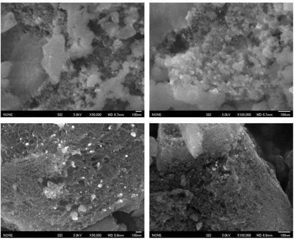 使用掃描電鏡在不同放大倍數(shù)下觀察氧化前(活性炭1)和氧化后(活性炭2)的表面形貌。根據(jù)SEM顯微照片在圖2,兩者的活性炭具有不同的形狀和孔的尺寸高度異質(zhì)的表面。
