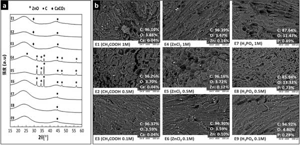活性炭的X射線(xiàn)衍射圖如圖1-a所示。峰值在2θ=44在所有衍射圖中觀察到的6°歸因于對(duì)應(yīng)于石墨(00-001-0646)的(101)平面。與其他材料不同,活性炭的衍射圖也顯示在2θ=26.4°歸因于石墨(00-001-0646)的(002)平面。ZnO和CaCO3可能是在熱處理過(guò)程中作為原材料組分和活化劑之間二次化學(xué)反應(yīng)的產(chǎn)物或由于前體中固有的殘留礦物質(zhì)含量而產(chǎn)生的。經(jīng)過(guò)掃描電鏡分析500倍的SEM顯微照片如圖1-b所示。觀察到所有活性炭都表現(xiàn)出異質(zhì)表面形態(tài),其由不規(guī)則形式的成組薄片組成。在用ZnCl2活化的碳的表面上觀察到與氧化鋅相對(duì)應(yīng)的沒(méi)有特定形狀的白色小顆粒(通過(guò)XRPD分析證實(shí))。此外,EDS分析顯示存在分散在整個(gè)表面的碳(C)、氧(O)和鋅(Zn),從而證實(shí)了ZnO顆粒分散在這些吸附劑的表面上。
