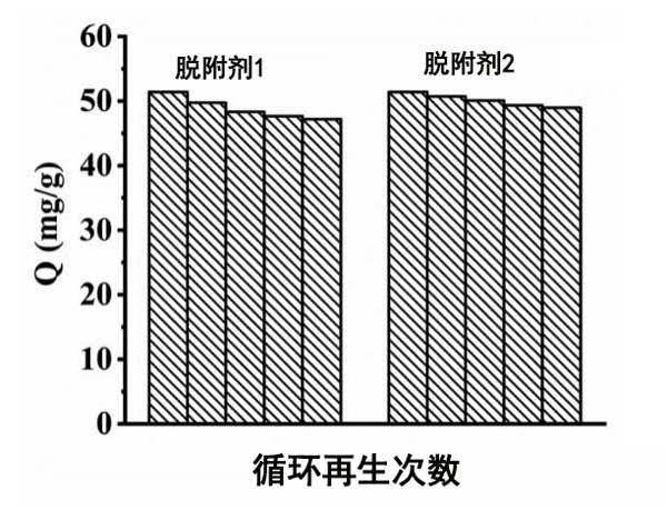 改性活性炭的回收利用在實際應用中具有重要意義,因為它可以降低生產(chǎn)成本,節(jié)省時間。為了研究改性活性炭回收的重要指標,我們考慮了吸附劑活性基團的性質。在本研究中,對兩種改性后的活性炭進行再生。將0.1g改性活性炭吸附的鎘離子分別放入兩種溶液中,在恒溫震蕩器中放置6小時進行解吸再生。然后重復吸附和解吸實驗5次,樣品溶液再吸附鎘離子的溶解度為0.1g/L。圖4表明0.1mol/L聚乙烯多胺溶液是改性活性炭的合適再生劑,因為聚乙烯多胺具有很強的絡合能力,可以在不破壞吸附劑原有結構的情況下解吸金屬離子。這些結果證明活性炭不僅具有較高的去除率,而且具有良好的回收性能,具有良好的應用前景。