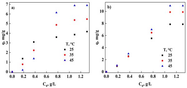 平衡吸附分析使我們能夠獲得不同等溫線模型的參數(shù),表明在去除污染物時進(jìn)行了何種類型的過程。在圖1中,顯示了使用粉末活性炭(圖1a)和活性炭(圖1b)在不同溫度下DNS的吸附能力。還觀察到3,5-二硝基水楊酸在兩種吸附劑中的吸附都隨著溫度的升高而顯著影響,隨著溫度的升高呈現(xiàn)出更大的吸附。因此,在45℃時,活性炭和粉末活性炭的大吸附容量分別為6.97和11.57mg/g。這可能是由于去除過程的環(huán)境,這會導(dǎo)致吸附劑表面隨著溫度的升高而增加其對3,5-二硝基水楊酸吸附的參與。使用商用活性炭的文獻(xiàn)中也報(bào)道了類似的行為。在其他研究中,使用這種吸附劑還觀察到,基于苯酚、高氯酸鹽和重金屬等的不同化合物的吸附能力有所增加。