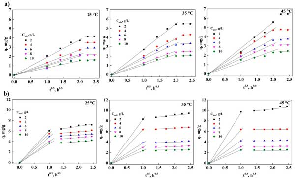 外部和粒子內(nèi)傳質(zhì)過程的分析可以對3,5-二硝基水楊酸的吸附產(chǎn)生顯著影響,在去除3,5-二硝基水楊酸時可能存在由于物質(zhì)傳輸造成的限制,這有必要對這種現(xiàn)象進(jìn)行分析。圖2a是以外擴(kuò)散模型為基礎(chǔ)構(gòu)建的,從中可以看出,對于活性炭,在吸附過程中接觸長達(dá)6小時的實(shí)驗(yàn)點(diǎn)處存在一條直線,這表明存在以下可能性,在任何溫度的過程中通過外部傳質(zhì)控制。圖2b顯示了粉末活性炭在3,5-二硝基水楊酸吸附中獲得的實(shí)驗(yàn)數(shù)據(jù)的表示,其中在與吸附劑接觸1小時時觀察到一條直線。這表明使用活性炭粒子不存在外部傳質(zhì)問題,因?yàn)?,5-二硝基水楊酸會迅速從溶液中去除,擴(kuò)散到表面。此外,這表明活性炭顆粒中的吸附過程可能是由于表面存在的官能團(tuán)。根據(jù)這些結(jié)果,確定是否也存在內(nèi)部傳質(zhì)問題很重要,從而能夠確定3,5-二硝基水楊酸刪除過程是否受到這種現(xiàn)象的存在的顯著影響。