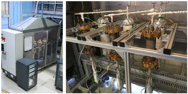 圖1:實驗室規(guī)模的甲烷化試驗臺(左),反應器和熱交換器(右)。