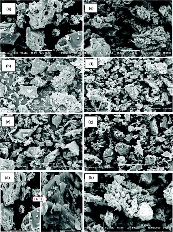 材料的SEM圖像在圖1中給出;钚蕴烤哂胁痪鶆虻墓饣砻妫郊s為50μm(圖1a)。在用硝酸和過氧化氫進(jìn)行氧化處理后,氧物質(zhì)(羧基和硝酸鹽基團(tuán))被接枝,導(dǎo)致活性炭-OH的表面比活性炭更粗糙(圖1e)。通過APTES處理接枝氨基硅烷是成功的:活性炭-APTES和活性炭-OH-APTES表面分別比活性炭和活性炭-OH更光滑(圖1d和f)。裂縫和不均勻的空腔可用作氟化物的吸附位點(diǎn)。存在的粗糙表面和大量白色顆粒證實(shí)了Al顆粒的添加(圖2c、g和h)。這些白色顆?梢詫(duì)應(yīng)于結(jié)合到材料表面的不同形狀和尺寸的Al納米顆粒的不同簇。