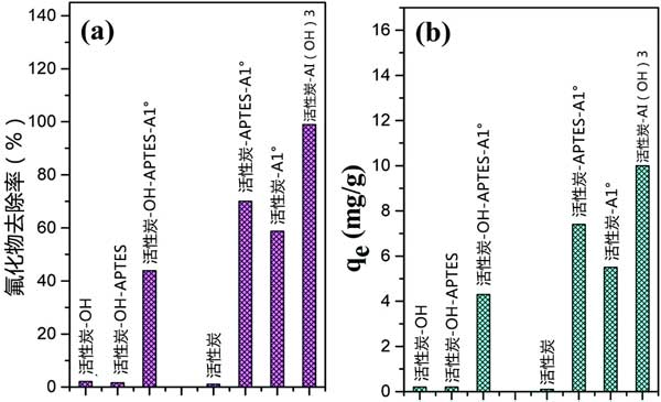 圖2:活性炭的各種處理對(duì)(a)氟化物去除百分比和(b)吸附能力的影響。