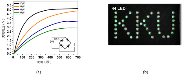 圖3:(a)由活性炭制造的摩擦納米發(fā)電機產(chǎn)生的電力充電的電容器的充電電壓曲線(b)發(fā)電機電輸出可瞬間點亮44個綠色LED。