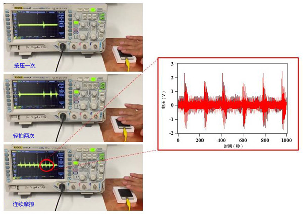圖4:在單電極配置下使用手指輕敲和生成的電壓信號的插圖演示了活性炭制造的發(fā)電機運動傳感應(yīng)用。