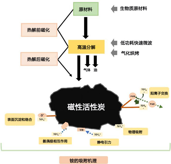 圖1:活性炭生產(chǎn)概述,包括可能的原料和熱解方法的非詳盡示例,以及可能發(fā)生的銨吸附機制的范圍。