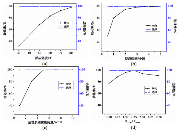 為了確定活性炭的催化性能,討論了反應溫度、反應時間、催化劑用量和醇/醛摩爾比對苯甲醛轉化率的影響。測試結果如圖2a-d所示。結果表明,隨著反應溫度、反應時間和催化劑用量的增加,苯甲醛轉化率逐漸升高,直至反應溫度達到80℃,反應時間達到5小時,催化劑用量為苯甲醛質量的5%。在上述條件下,苯甲醛轉化率在99%以上。當醇/醛的摩爾比低于1.75時,苯甲醛的轉化率隨著乙烯醇的增加而逐漸增加。當乙二醇用量繼續(xù)增加時,苯甲醛轉化率有一定程度的下降。苯甲醛轉化率降低的主要原因是隨著乙二醇用量的增加,反應體系中苯甲醛的濃度降低,導致分子間的碰撞減少。在所有條件下,苯甲醛乙二醇縮醛的選擇性均在99%以上,表明存在競爭催化機制。