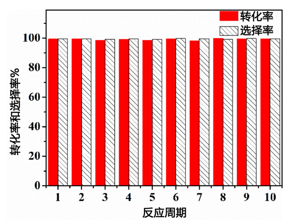 最后通過回收實驗測試了活性炭催化劑的穩(wěn)定性,測試結果如圖3所示。在催化劑可重復使用性能的探索中,活性炭催化劑用溶劑環(huán)己烷洗滌,然后進入下一個反應循環(huán)。具體過程為將反應完成后的固體離心分離出來,再用環(huán)己烷洗滌固體3次,以完全去除前一輪反應表面殘留的少量液體。即使在連續(xù)運行10次后,催化劑的性能也沒有顯著降低,仍然達到99%的苯甲醛轉化率和99%的選擇性。因此,活性炭催化劑是用于研究苯甲醛乙二醇縮醛反應的優(yōu)異且穩(wěn)定的可回收固體酸催化劑。