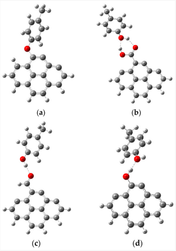 預(yù)計(jì)甲酚在活性炭上的吸附將通過各種類型的相互作用進(jìn)行,例如電子供體-受體機(jī)制、靜電相互作用、π-π相互作用和氫鍵形成。然而,在各種類型的相互作用中,活性炭和被吸附物之間的氫鍵是有助于吸附過程的重要相互作用類型之一。因此,在本研究中,使用DFT方法研究了對甲酚和活性炭之間的氫鍵相互作用?紤]到它們之間的氫鍵,研究了對甲酚與原始活性炭和功能化活性炭的相互作用。圖1代表各種相互作用的優(yōu)化結(jié)構(gòu)。