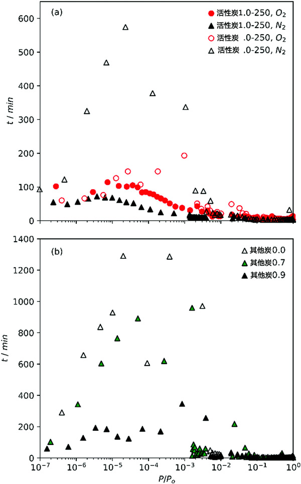 圖1:(a)O2和N2等溫線在活性炭上的相對壓力增加和(b)N2等溫線其他炭的點(diǎn)之間的時(shí)間。