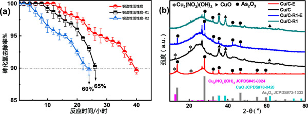 銅改性活性炭通過水洗和吹掃氣體法進(jìn)行再生。為此,活性炭樣品首先在100℃的熱空氣中活化3小時(shí)。然后用去離子水浸泡清洗4-5次,放入電熱風(fēng)烘箱中110-120℃烘干。之后,將樣品置于氮?dú)鈿夥障碌墓苁綘t中,并使用程序升溫控制器升高溫度?紤]到通過在180℃下烘烤獲得的材料,溫度首先設(shè)定在20-180℃。之后,停止加熱,將樣品冷卻至室溫。取出樣品,停止氮?dú)饬,?duì)再生材料進(jìn)行測(cè)試。如圖3a所示,R的再生效率(R為再生吸附劑與新鮮吸附劑的穿透時(shí)間之比)在一個(gè)再生循環(huán)后為65%。在第二次再生循環(huán)后,樣品恢復(fù)效率R達(dá)到60%,證實(shí)了活性炭吸附劑對(duì)去除AsH3具有合理的再生能力。為了確定活性炭吸附劑再生后表面相的變化,通過XRD分析活性炭吸附劑。如圖3b所示,再生后活性炭-R1中35.6°、38.8°和61.8°的CuO衍射峰強(qiáng)度明顯增加,但沒有Cu2(NO3)峰被找到。這表明在再生過程中回收的一些CuO物種可能被中間體Cu2(NO3)(OH)3轉(zhuǎn)化。此外,活性炭-R1樣品中As2O3在28.0°、32.2°、35.5°、42.6°、46.4°、55.0°和59.6°處的結(jié)晶峰明顯減弱。推測(cè)中間體Cu2(NO3)(OH)3向吸附活性中心CuO的轉(zhuǎn)變和結(jié)晶As2O3的分離可能是活性炭吸附劑再生性能好的原因。