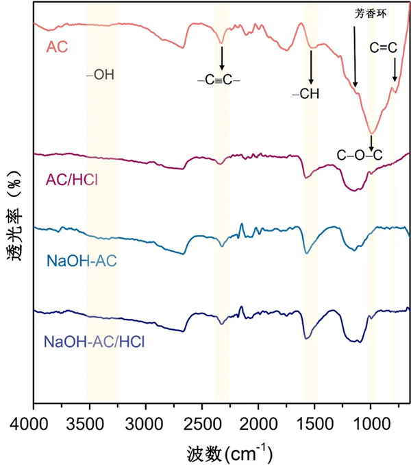 圖1:傅里葉變換紅外光譜、FTIR、未處理的活性炭、吸附后的堿處理活性炭的示意圖。