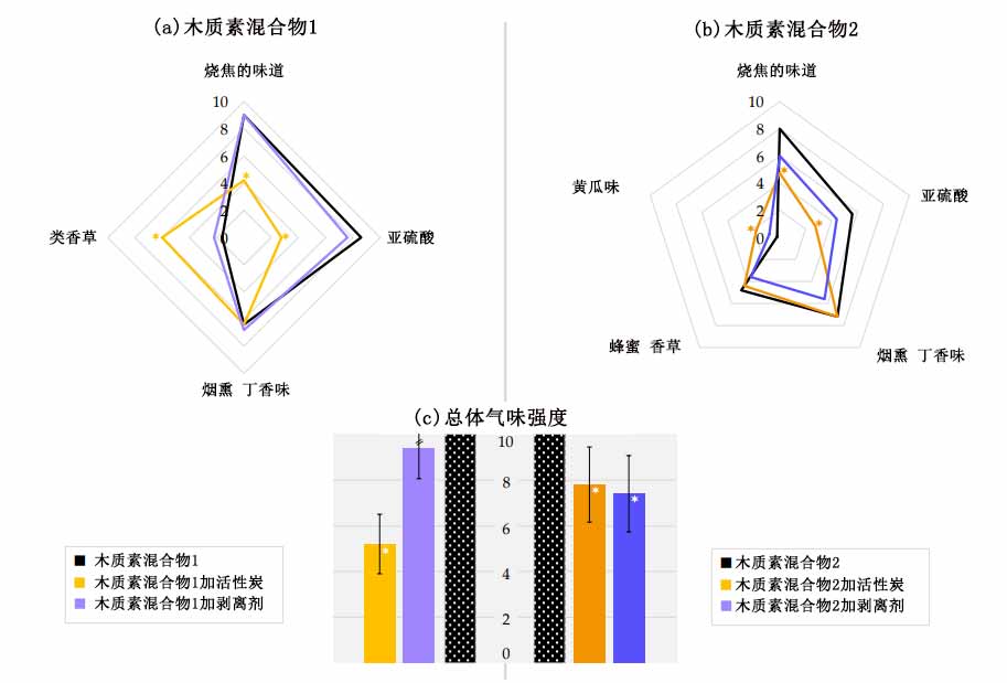 圖1:(a)木質(zhì)素混合物1和(b)混合物2的氣味特征,(c)用活性炭或汽提劑處理的兩種木質(zhì)素混合物的整體氣味的等級(jí)。