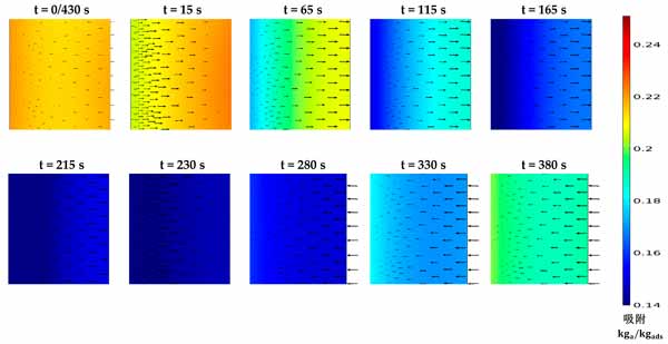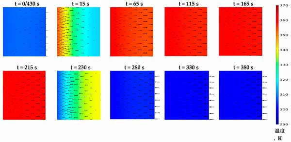 活性炭復(fù)合吸附劑的壓力和溫度決定了平衡吸收,它代表了在給定時(shí)間分別在吸附和解吸階段可以達(dá)到的最大和最小吸收容量。然而,顆粒內(nèi)和顆粒間的傳質(zhì)阻力表明吸附材料在每種給定情況下可以多快達(dá)到其平衡吸收能力。這突出了在本研究中同時(shí)求解兩種傳質(zhì)機(jī)制與其他控制方程的重要性,以顯示促進(jìn)傳熱對(duì)傳質(zhì)的凈效應(yīng)。圖2顯示了在430秒循環(huán)時(shí)間內(nèi),考慮到預(yù)熱和預(yù)冷階段均為30秒的時(shí)間間隔內(nèi)代表性部分的固結(jié)吸附劑域的溫度分布。