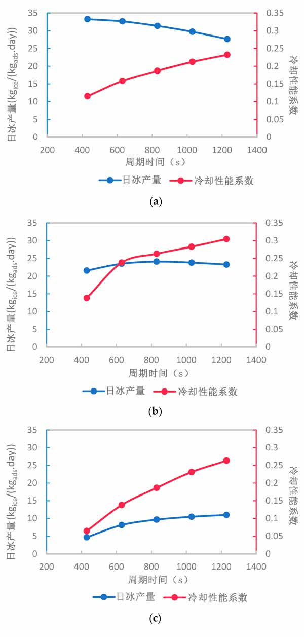 在活性炭厚度為2、5和10mm時(shí),循環(huán)時(shí)間的變化對(duì)制冰系統(tǒng)的每日制冰量和冷卻性能系數(shù)的凈影響如圖4所示。總體而言,在給定范圍內(nèi)增加循環(huán)時(shí)間可以增加或減少系統(tǒng)的每日制冰量,具體取決于活性炭復(fù)合材料的厚度。然而,無(wú)論活性炭復(fù)合材料的厚度如何,系統(tǒng)的冷卻性能系數(shù)通過(guò)增加循環(huán)時(shí)間而增加。盡管如此,系統(tǒng)冷卻性能系數(shù)在1230的較長(zhǎng)循環(huán)時(shí)間和5mm活性炭復(fù)合材料厚度下達(dá)到其最大值。通過(guò)增加活性炭復(fù)合材料的厚度,日冰產(chǎn)量在不同循環(huán)時(shí)間內(nèi)的變化范圍顯著減小,這可以通過(guò)比較圖4a-c中給出的每日制冰量范圍看出。這歸因于活性炭復(fù)合材料厚度較厚時(shí)有效吸收的減少。