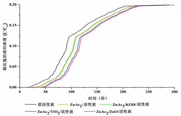 通過(guò)選擇合成吸附劑對(duì)硫化氫氣體的吸附效果產(chǎn)生了如圖3所示的吸附曲線。這些吸附曲線也與使用浸漬活性炭和原活性炭實(shí)現(xiàn)的吸附進(jìn)行了比較。我們發(fā)現(xiàn)吸附趨勢(shì)呈指數(shù)增長(zhǎng),形成S曲線。突破時(shí)間被確定為硫化氫濃度達(dá)到1ppm(突破濃度)和飽和濃度達(dá)到幾乎5000ppm的值所用的時(shí)間。與其他雙金屬活性炭吸附劑相比,ZnAc2/ZnO/活性炭吸附劑的吸附表現(xiàn)出優(yōu)異的性能。雙金屬活性炭吸附劑的合成表現(xiàn)出良好的性能,與ZnAc2/活性炭和原活性炭相比,硫化氫的吸附增加了30.2-45.8%和85.9-89.1%。因此,采用這種浸漬方法的活性炭表現(xiàn)出的高吸附增強(qiáng)了硫化氫吸附能力。