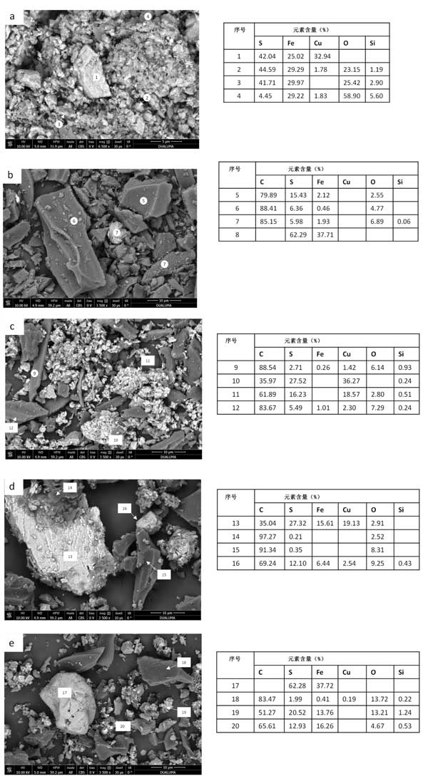 最終殘留物的SEM-EDS圖像在圖2顯示,并證實了通過XRD獲得的結(jié)果。圖2a顯示了礦物浸出后固體殘渣的SEM圖像?梢杂^察到大的黃銅礦顆粒的存在(點1),黃鐵礦的小顆粒具有不同的氧化礦物(點2、3和4)。樣品活性炭浸出后的固體殘留物圖像(圖2b)顯示活性炭的存在,其表面具有硫原子和一些Fe(點5、6和7)和黃鐵礦(點8)。沒有觀察到銅的存在,這與其高提取值(99.1%)一致。圖2c顯示了樣品活性炭1:0.25浸出后獲得的固體殘留物的圖像。在活性炭的表面上可以觀察到硫和銅的存在,可能是由于CuS(點9-12)。用生物炭浸出礦物后的固體殘渣分析見圖2d(比例1:1)和(比例1:0.25)。根據(jù)XRD分析,有黃銅礦顆粒(點13)類似于沒有生物炭的礦物浸出的固體殘渣。與添加活性炭相比,生物炭顆粒的表面硫含量較低(點14和15),表明生物炭吸附能力較低,這與生物炭的較低表面積一致。生物炭表面上存在的一些硫可能是由于與浸出劑的反應(yīng)和硫物質(zhì)的低吸附性。最后,觀察到不同礦物的聚集體(第16點)。關(guān)于生物炭比例為1:0.25的固體殘留物,黃鐵礦的存在(第17點),生物炭與少量S、Cu和Fe結(jié)合(第18點),可以觀察到不同礦物和碳顆粒的小顆;旌衔(第19點和第20點)。