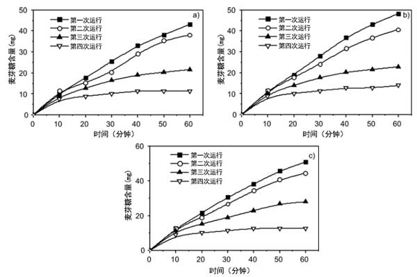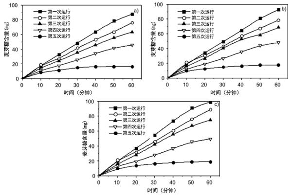 在間歇反應(yīng)器中檢測(cè)游離酶和固定化酶的水解活性。通過將可溶性淀粉溶解在蒸餾水中制備%淀粉溶液,并通過0.1M/HCl將pH值調(diào)節(jié)至4.7。然后將1g含有α-淀粉酶的活性炭纖維置于測(cè)試小瓶中。隨后,加入100cm3的淀粉溶液,并將系統(tǒng)在40℃下不斷搖動(dòng)的水浴中孵育。每10分鐘抽取1cm3溶液以確定水解麥芽糖的量。通過加入1cm3的3,5-二硝基水楊酸試劑終止反應(yīng)。還在沸水浴中孵育5分鐘。還原糖(麥芽糖)的量通過分光光度法在540nm處測(cè)定。