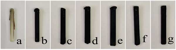圖2:極限氧指數(shù)測試后復合材料的數(shù)字圖像:(a)聚乳酸,(b)添加活性炭3%,(c)添加活性炭6%,(d)添加活性炭9%,(e)添加改性活性炭3%,(f)添加改性活性炭6%,(g)添加改性活性炭9%。