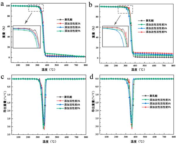 熱重分析結(jié)果列于圖3中。所有樣品均呈現(xiàn)單一熱降解階段,但5%質(zhì)量損失溫度(T5%)或熱降解速率最高溫度(Tmax)略有不同。純聚乳酸在322℃時開始快速降解,如圖3a所示,其Tmax達到363℃,并且在400℃時幾乎所有質(zhì)量都損失了。在800℃的終端溫度下測得相應的殘?zhí)柯蕛H為1.35%。相比之下,當應用改性活性炭時,酸性添加劑(磷酸鹽)會促進聚乳酸復合材料的較早分解,這與之前的結(jié)果一致。殘?zhí)柯孰S著復合材料中改性活性炭的加載而逐漸增加。純聚乳酸和改性活性炭復合材料的Tmax幾乎沒有差異,分別為363℃、364℃、357℃和363℃。因此可以看出,改性活性炭負載對聚乳酸降解沒有影響。在600℃到800℃的范圍內(nèi),聚乳酸燃燒的殘余物沒有質(zhì)量變化,但在一定程度上可以觀察到輕微的質(zhì)量損失,表明加入改性活性炭后復合材料的燃燒延遲。