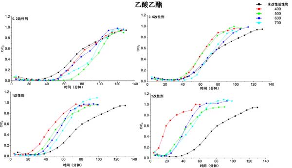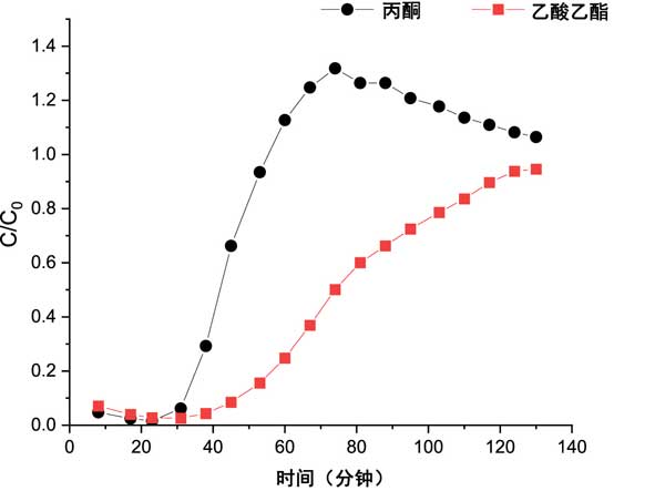 圖2:改性活性炭吸附丙酮和乙酸乙酯的突破曲線。