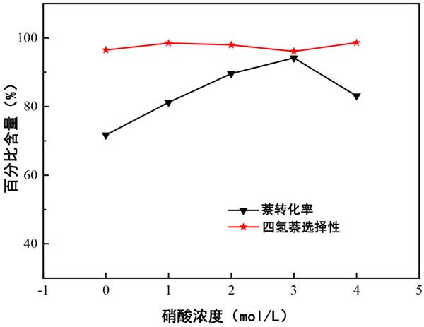 圖2:改性劑濃度對(duì)萘轉(zhuǎn)化率和四氫化萘選擇性的影響。