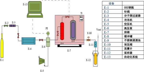 首先,來自儲罐的CO2通過標(biāo)稱尺寸為1µ的過濾器,以避免任何雜質(zhì)進(jìn)入工藝路徑。然后,CO2被引導(dǎo)至冰箱單元,其溫度降至-10℃和60bar。液化CO2使用往復(fù)泵加壓,并轉(zhuǎn)化為殼管式配置的調(diào)壓鼓。在這個鼓中,流體溫度被設(shè)置為適當(dāng)?shù)臏囟纫赃_(dá)到超臨界流體條件。該鼓的設(shè)計旨在減少波動,熱交換通過使用溫度精度設(shè)置為1K的1000W元件循環(huán)水進(jìn)行。壓力表安裝在調(diào)壓鼓的輸出端,以顯示出口流體壓力。之后,液體被引導(dǎo)到裝有10克活性炭和玻璃珠的萃取池。在提取單元的輸入和輸出處安裝了兩個孔隙率為1微米的過濾器,以防止顆粒逸出。細(xì)胞中玻璃珠的存在使CO2均勻分布在提取單元內(nèi)。在用SC-CO2加載萃取池后,將萃取池設(shè)置在適當(dāng)?shù)臏囟群蛪毫ο录s45分鐘。在靜態(tài)階段之后,動態(tài)階段從打開采樣閥開始。為了防止閥門凍結(jié),它被包裹在加熱元件中。在動態(tài)時間內(nèi),使用冰柜將樣品采集溫度保持在0℃以下。每個實驗一式三份進(jìn)行,圖1顯示了超臨界流體裝置的詳細(xì)信息,通過將每個初始活性炭的溶質(zhì)重量除以計算超臨界回收率。