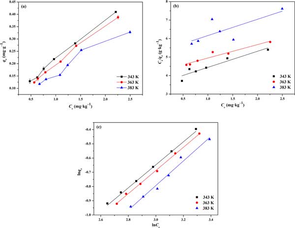 圖2:活性炭對(duì)玉米赤霉烯酮的吸附能力(a)和Langmuir(b)和Freundlich(c)等溫線的擬合圖。