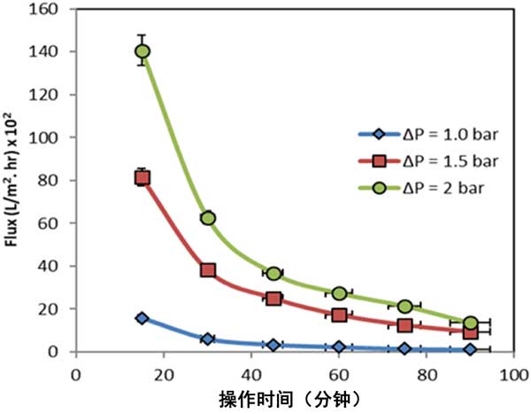 圖3顯示,在運行90分鐘后,在2bar的運行壓差下,達(dá)到的最高通量值。基于這些值,已知滲透通量值降低。發(fā)生這種情況是由于膜壁上不需要的溶解污染物顆粒堵塞,這些顆粒大于膜孔。這些顆粒堵塞膜表面的孔或卡在孔內(nèi)。這種膜壁堵塞與濃差極化現(xiàn)象密切相關(guān),在這種現(xiàn)象中,膜壁表面的污染物濃度較高,導(dǎo)致較低的流體流量,而通過膜的污染物最少。也可以在圖3中看到滲透通量隨著較高的操作壓力而增加,這對應(yīng)于膜操作的驅(qū)動力。施加到流過膜的進(jìn)料流的壓力將導(dǎo)致與膜孔相比顆粒尺寸更小的流體流可以通過膜,而較大的顆粒,例如污染物,將被保留。Fe、Mn、Zn、NH3–N、PO4各污染物從初始濃度1.38、1.30、0.92、0.90、0.93mg/L的總截留率分析結(jié)果分別為92.03、97.08、99.67、84.56、87.10%。這些分析結(jié)果顯示了這項工作的可喜成果,其中每項總拒絕率都在80%以上。